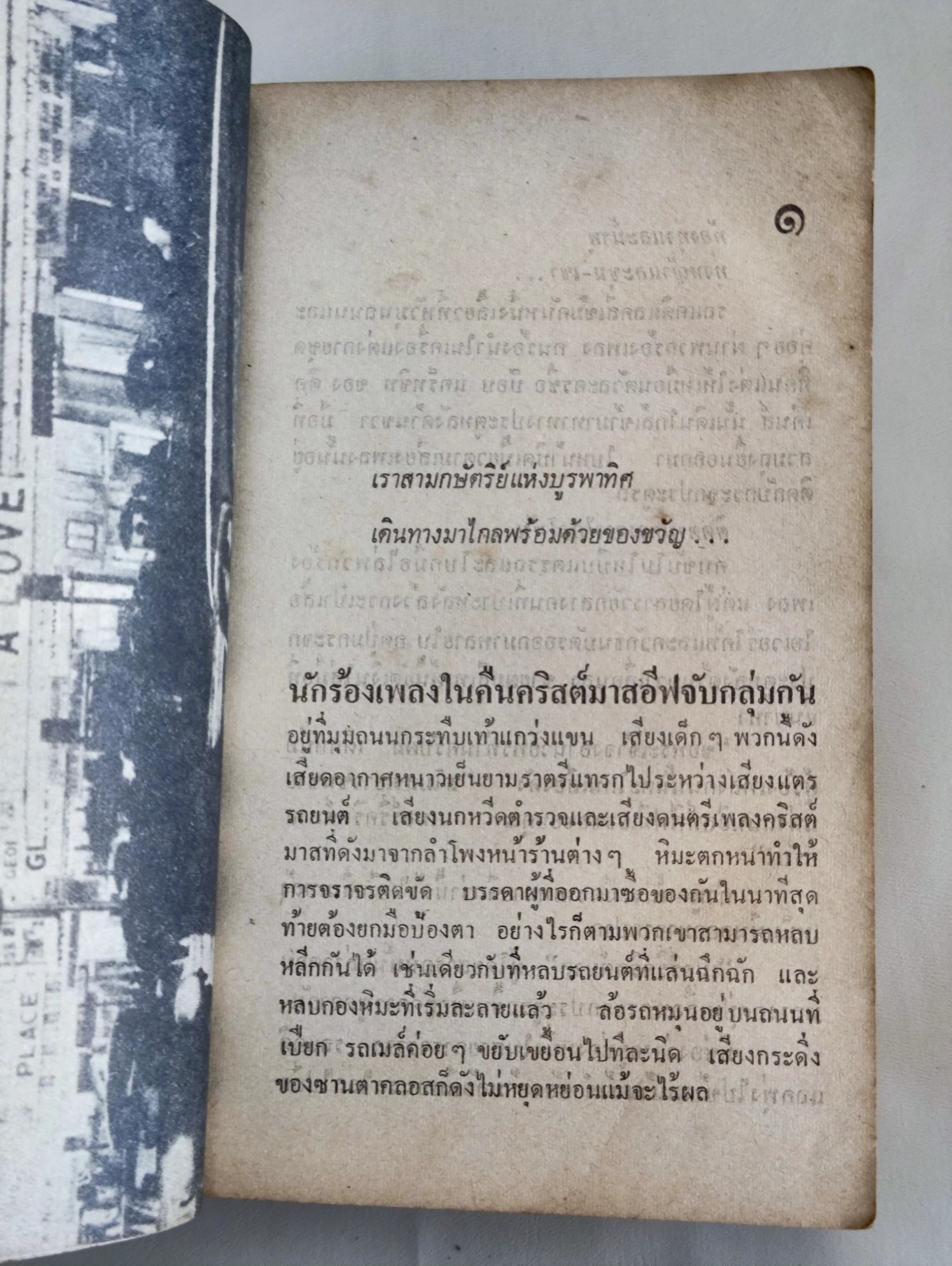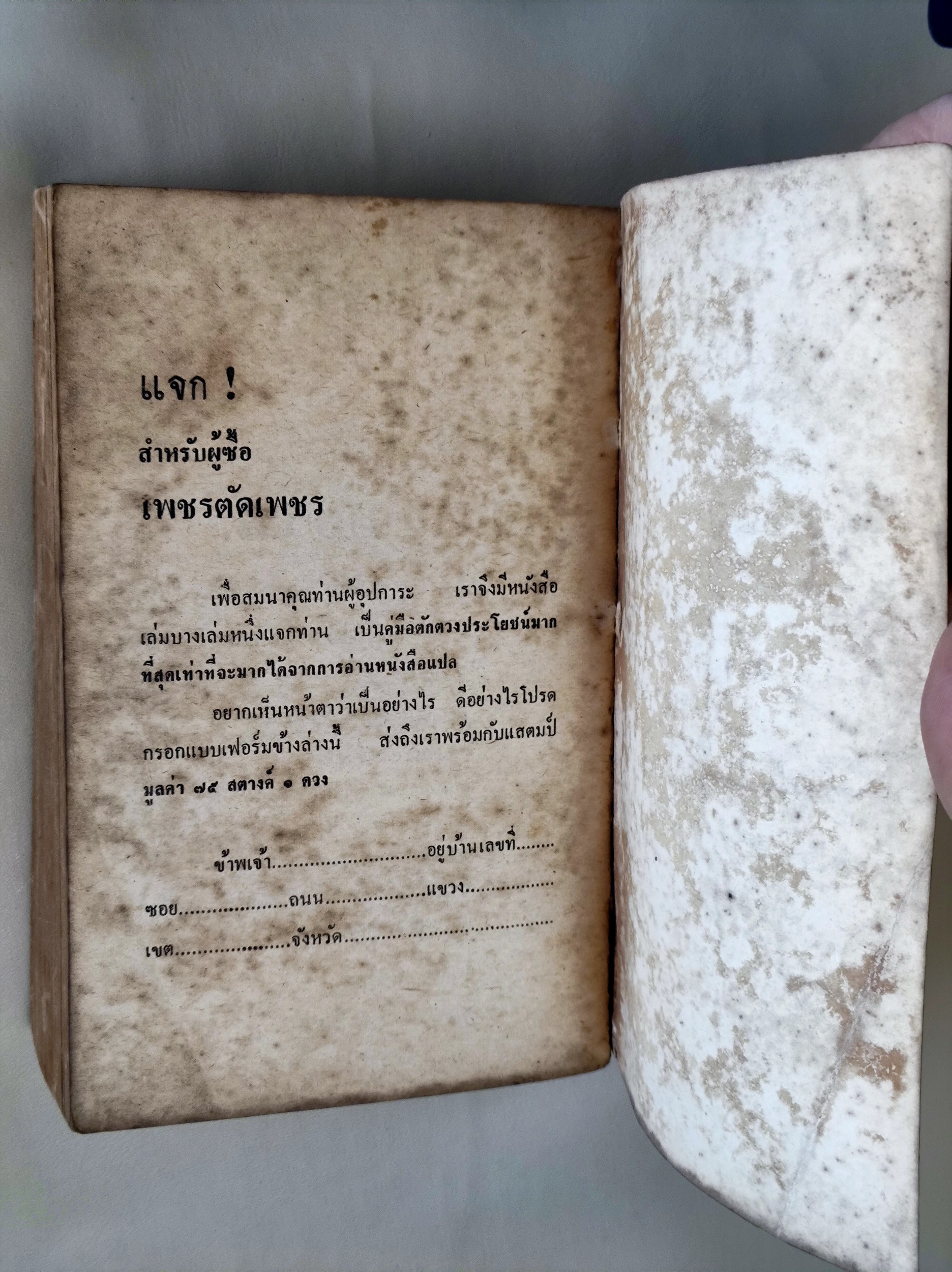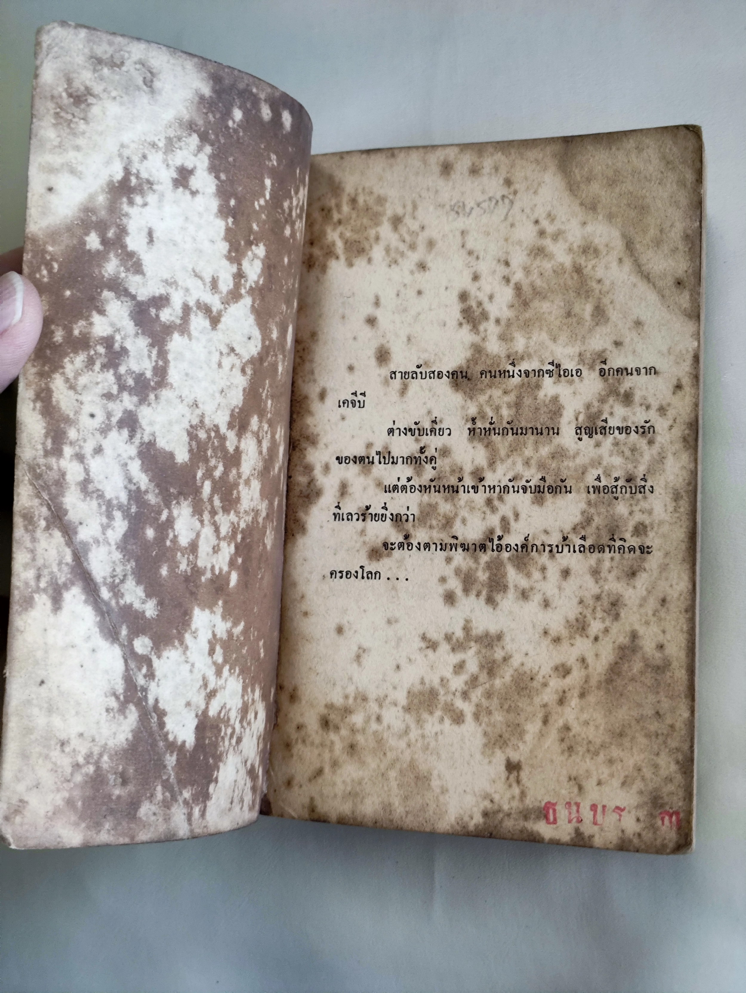 สภาพหนังสือ:ปกมอมแมม มีรอยเปื้อน ถลอกลอก ยับ เล็กน้อยตามภาพ , ใบรองปก-หลังปกเป็นจ้ำเหลืองประปรายทั่วแผ่น มีรอยเปื้อนคราบน้ำ , กระดาษเหลืองตามขอบ ต้น-ท้ายเล่มกระดาษเป็นจ้ำน้ำตาลกระจาย มีรอยเปื้อนคราบน้ำบางหน้า ไม่กระทบการอ่าน , สันหนังสือเหลือง และเป็นจุดเหลืองประปราย