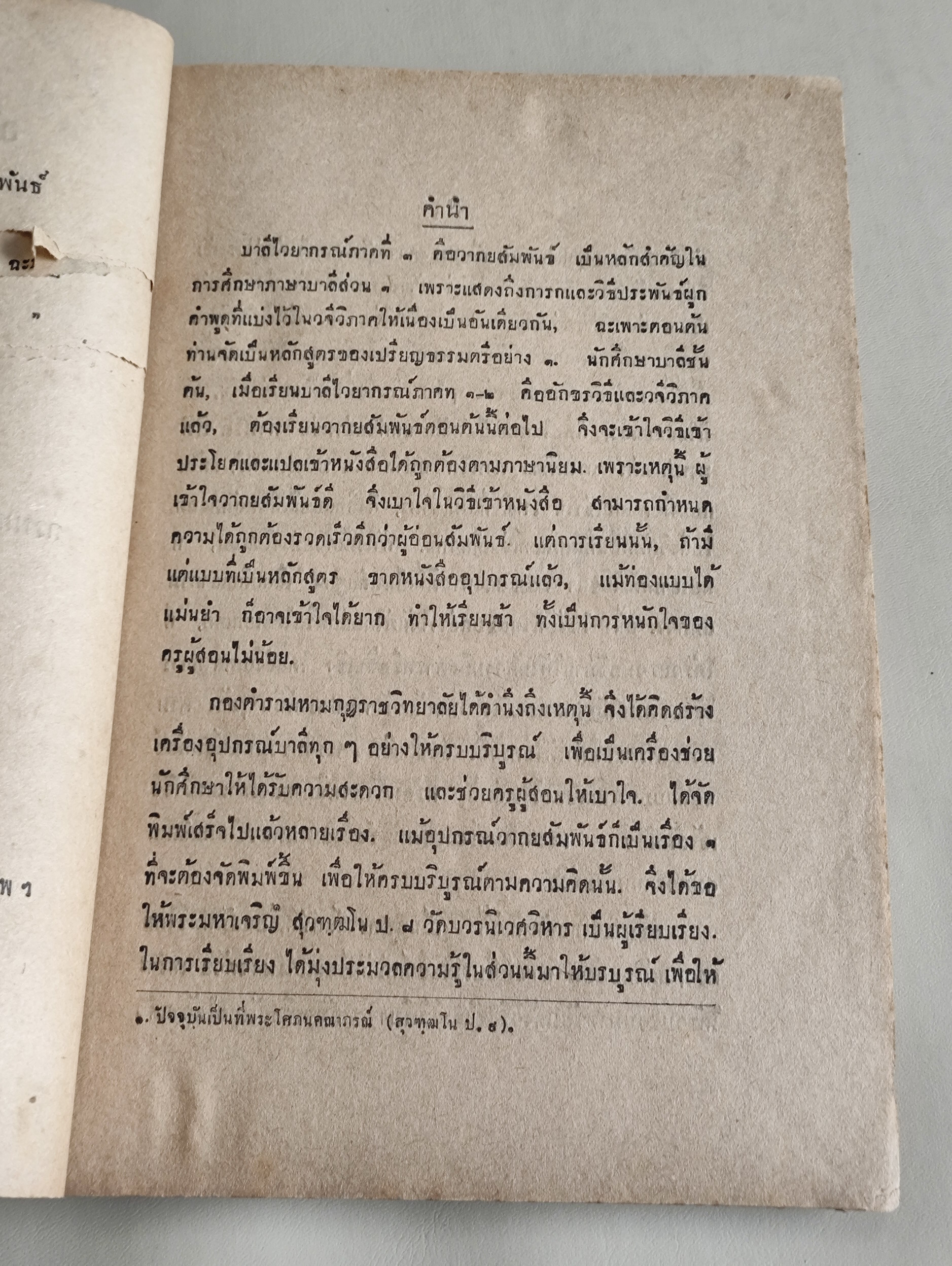 บาลีไวยากรณ์ภาคที่1 คือวากยสัมพันธ์ เป็นหลักสำคัญในการศึกษาภาษาบาลีส่วน1 เพราะแสดงถึงการกและวิธีประพันธ์ผูกคำพูดที่แบ่งไว้ในวจีวิภาคให้เนื่องเป็นอันเดียวกัน ฉะเพาะตอนต้นท่านจัดเป็นหลักสูตรของเปรียญธรรมตรีอย่าง1 เมื่อเรียนบาลีไวยากรณ์ภาคที่1-2 คืออักขรวิธีและวจีวิภาคแล้ว ต้องเรียนวากยสัมพันธ์ตอนต้นนี้ต่อไป