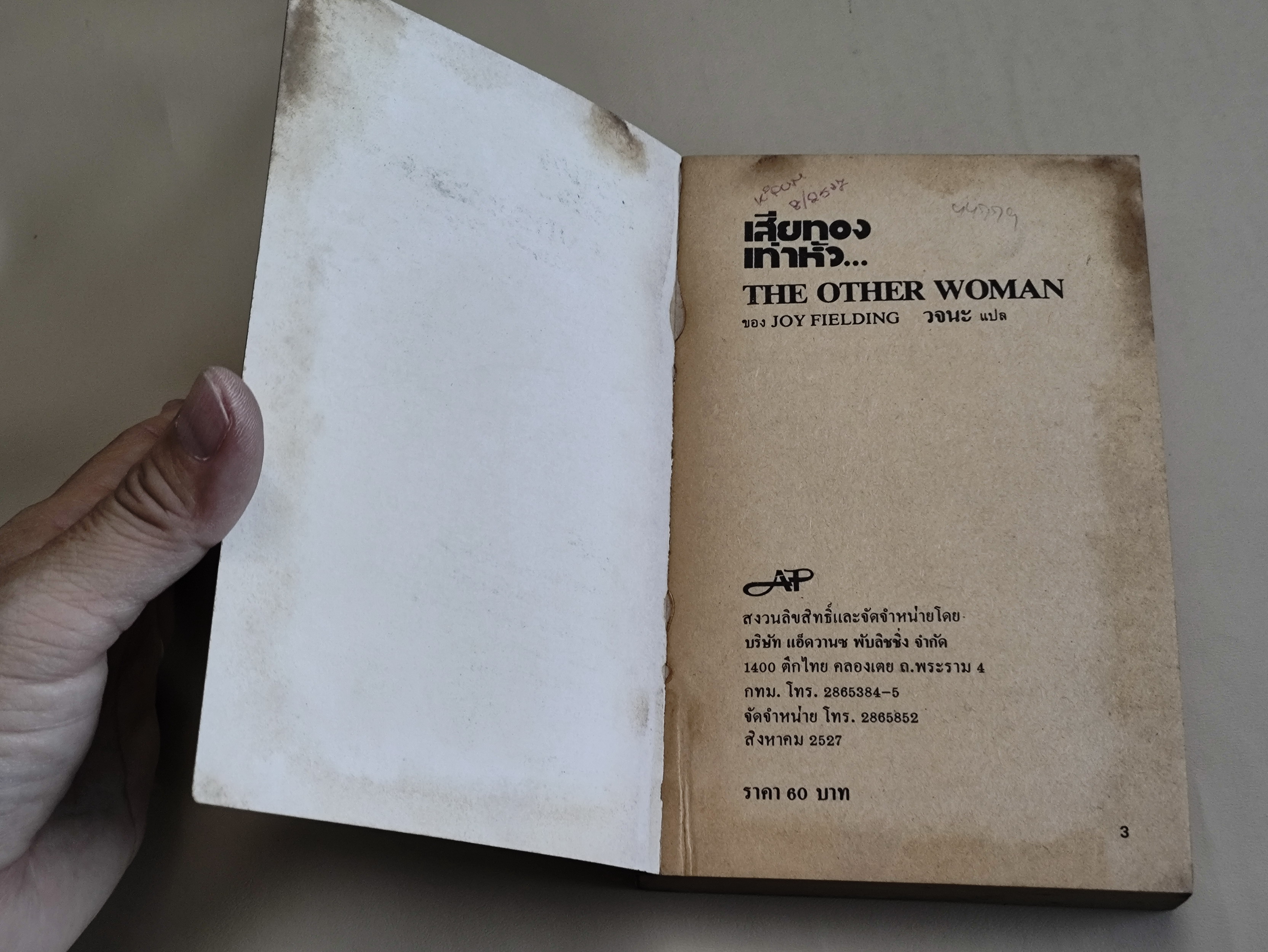 สภาพหนังสือ:ปกมีคราบเหลือง มีรอยขีดข่วน ถลอก ยับ ตามภาพ , ใบรองปก-หลังปกเป็นจ้ำเหลืองประปราย ใบรองปกหน้ามีลายเซ็นต์เจ้าของเดิม , กระดาษเหลืองตามขอบ และ เป็นจ้ำเหลืองประปราย , สันหนังสือเหลือง และเป็นจุดเหลืองประปราย