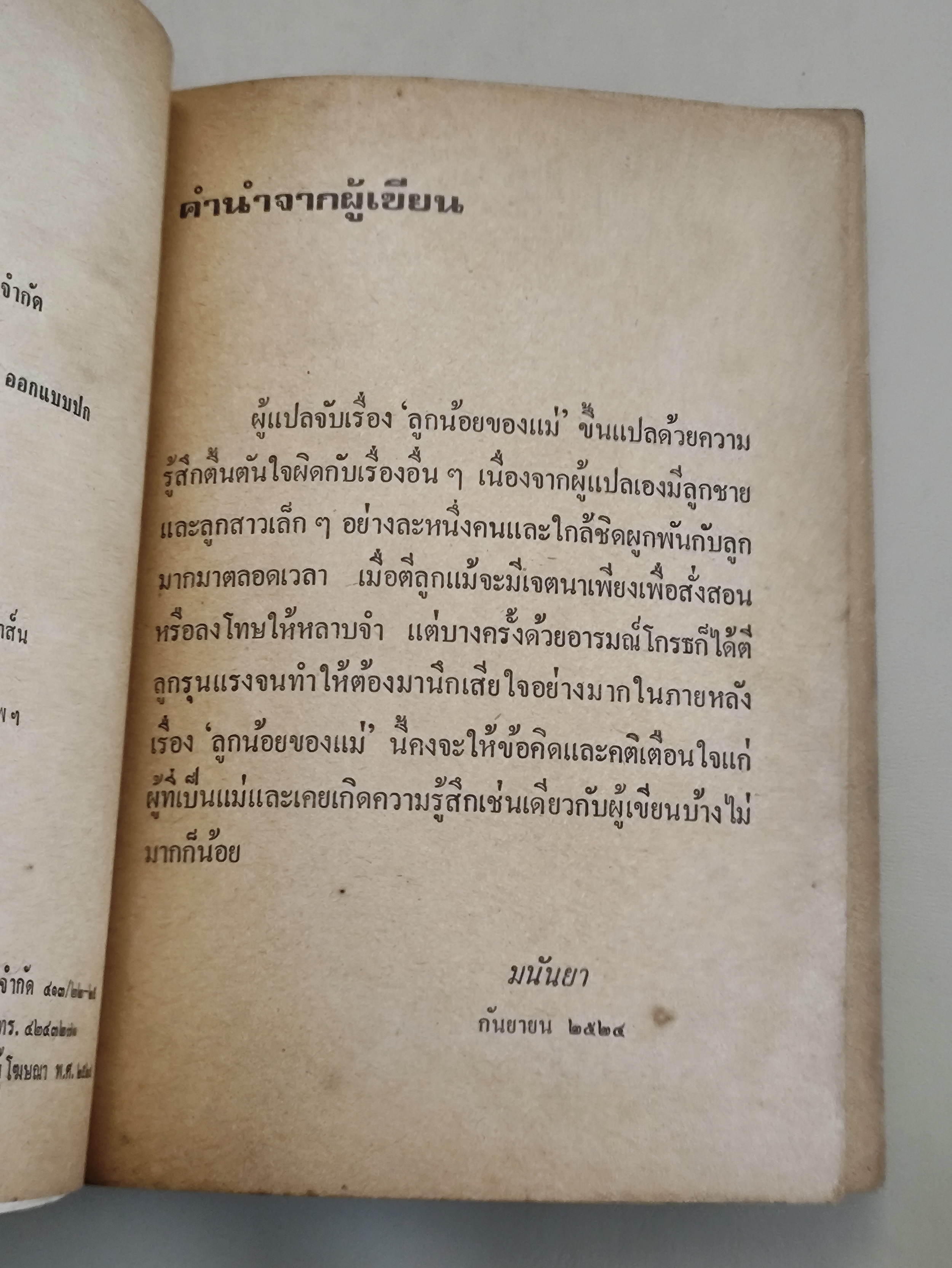 ผู้แปลจับเรื่อง "ลูกน้อยของแม่" ขึ้นแปลด้วยความรู้สึกตื้นตันใจผิดกับเรื่องอื่น ๆ เนื่องจากผู้แปลเองมีลูกชายและลูกสาวเล็กๆอย่างละหนึ่งคนและใกล้ชิดผูกพันกับลูกมากมาตลอดเวลา เมื่อตีลูกแม้จะมีเจตนาเพียงเพื่อสั่งสอนหรือลงโทษให้หลาบจำ แต่บางครั้งด้วยอารมณ์โกรธก็ได้ตีลูกรุนแรงจนทำให้ต้องมานึกเสียใจอย่างมากในภายหลัง