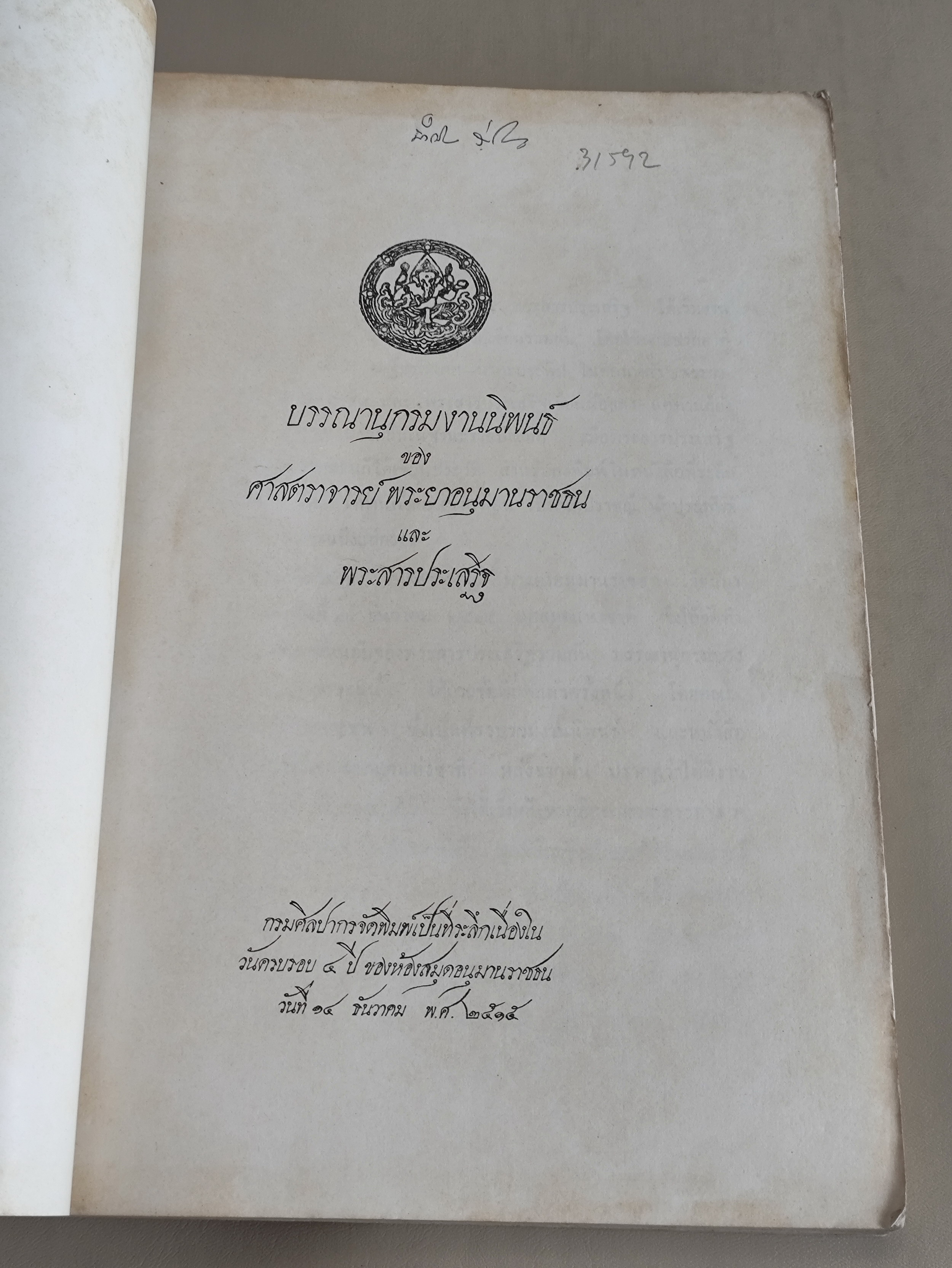 กรมศิลปากรจัดพิมพ์เป็นที่ระลึกเนื่องในวันครอบคอบ ๔ ปี ของห้องสมุดอนุมานราชธน วันที่ 14 ธันวาคม พ.ศ.2515